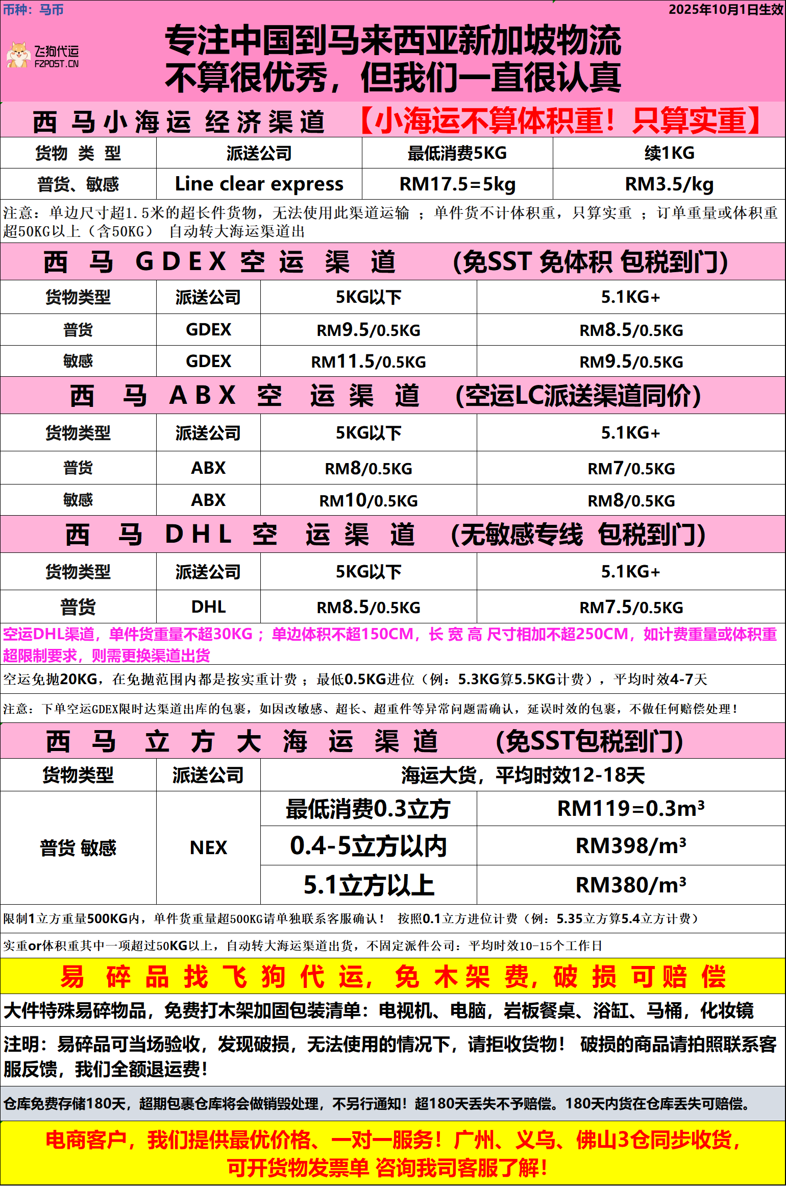* 默认体积重与实重比较,取较重者计算运费,免抛/半抛优惠请参考报价说明。